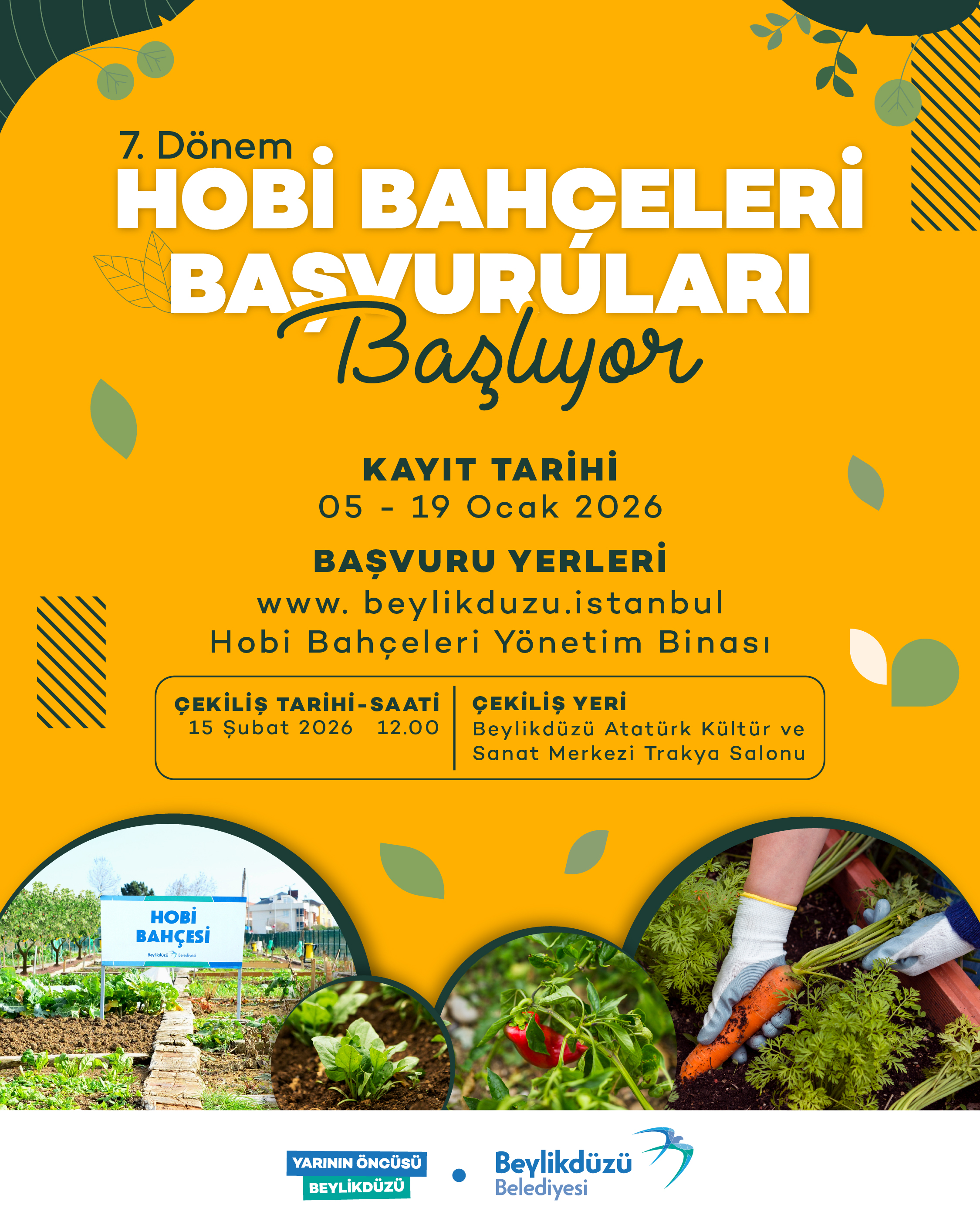 1. Hobi bahçesi müracaatlarından çekilişe hak kazananlar arasında 15 Şubat 2026 tarihinde Saat 12:00 da Beylikdüzü Atatürk Kültür ve Sanat Merkezi Trakya Salonunda noter huzurunda ve halka açık şekilde çekiliş yapılacaktır